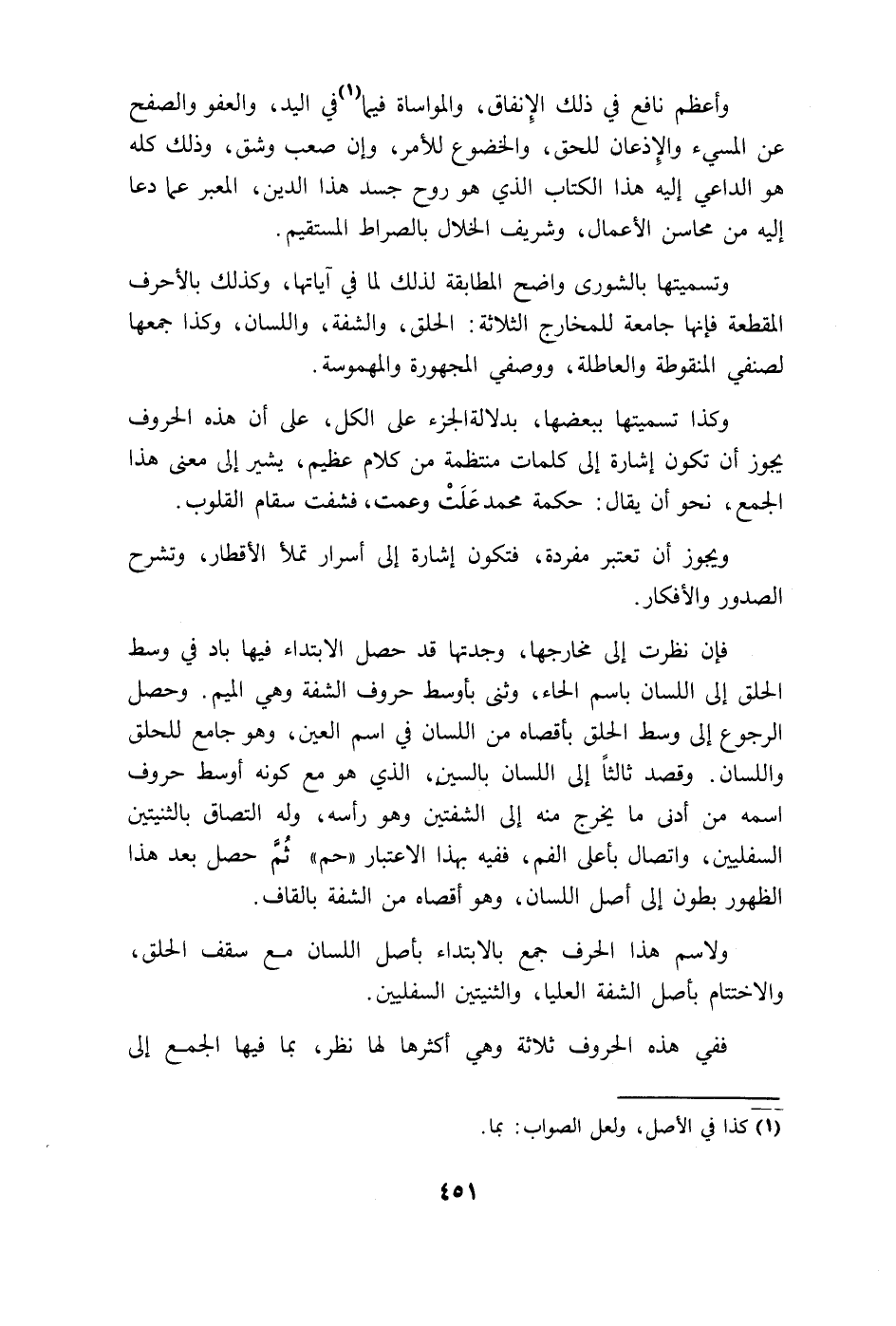 الحلق إلى اللسان باسم الحاء، وثنى بأوسط حروف الشفة وهي الميم. وحصل الرجوع إلى وسط الحلق بأقصاه من اللسان في اسم العين، وهو جامع للحلق واللسان.