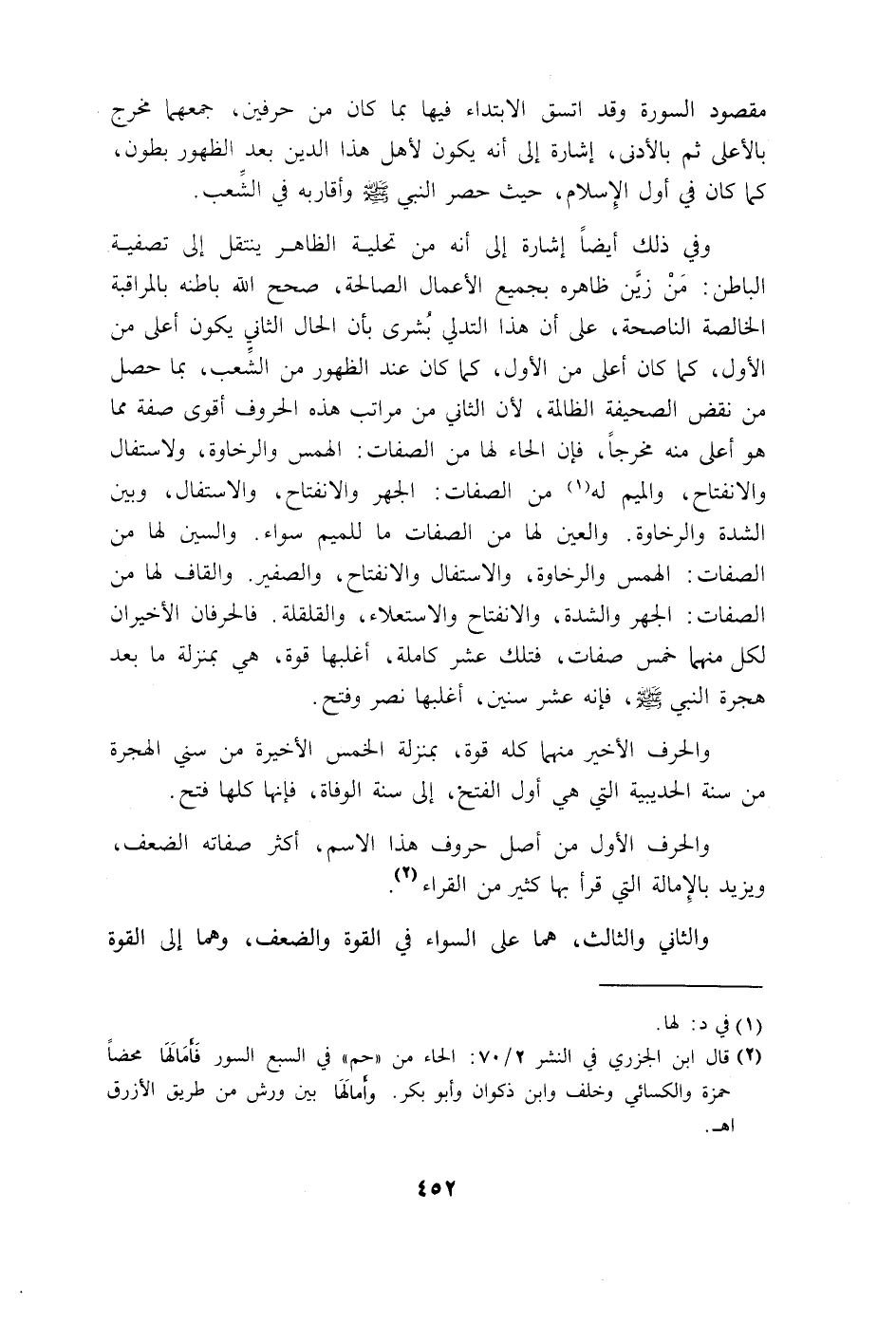 بالأعلى تْم بالأدنى، إشارة إلى أنه يكون لأهل هذا الدين بعد الظهور بطون، كما كان في أول الِإسلام، حيث حصر النبي - صلى الله عليه وسلم - وأقاربه في الشِّعب. وفي ذلك أيضاً إشارة إلى أنه من تحلية الظاهر ينتقل إلى تصفية الباطن: مَنْ زيَّن ظاهره بجميع الأعمال الصالحة، صحح الله باطنه بالمراقبة الخالصة الناصحة، على أن هذا التدلي بُشرى بأن الحال الثاني يكون أعلى من الأول، كما كان أعلى من الأول، كما كان عند الظهور من الشِّعب، بما حصل من نقض الصحيفة الظالمة، لأن الثاني من مراتب هذه الحروف أقوى صفة مما هو أعلى منه مخرجاً، فإن الحاء لها من الصفات: الهمس والرخاوة، والاستفال والانفتاح، والميم له من الصفات: الجهر والانفتاح، والاستفال، وبين الشدة والرخاوة.