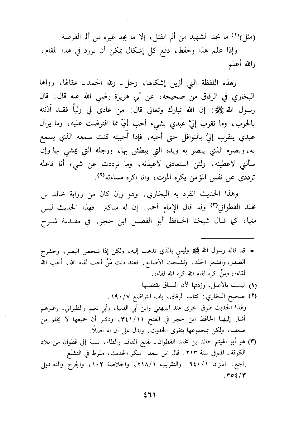 رسول الله - صلى الله عليه وسلم -: إن الله تبارك وتعالى قال: من عادى لي ولياً فقد آذنته بالحرب، وما تقرب إليَّ عبدي بشيء أحب إليَّ مما افترضت عليه، وما يزال عبدي يتقرب إليَّ بالنوافل حتى أحبه، فإذا أحببته كنت سمعه الذي يسمع به، وبصره الذي يبصر به ويده التي يبطش بها، ورجله التي يمشي بها وإن سألني لأعطينه، ولئن استعادني لأعيذنه، وما ترددت عن شيء أنا فاعله ترددي عن نفس المؤمن يكره الموت، وأنا أكره مساءته.