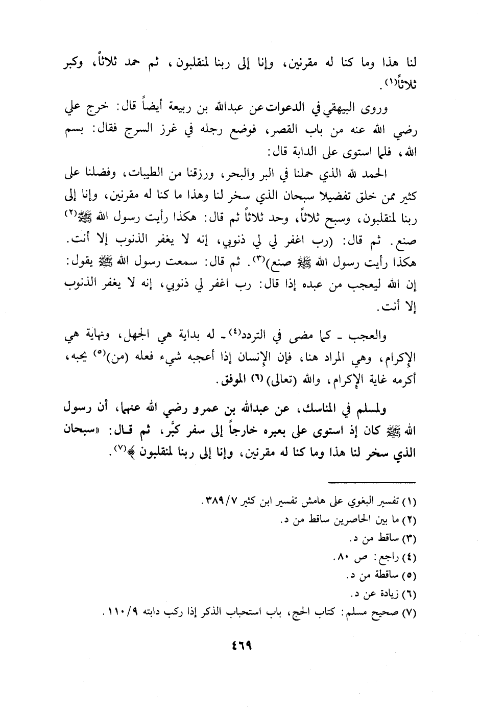 الله - صلى الله عليه وسلم - كان إذ استوى على بعيره خارجاً إلى سفر كبَّر، ثم قال: (سُبْحَانَ الَّذِي سَخَّرَ لَنَا هَذَا وَمَا كُنَّا لَهُ مُقْرِنِينَ (13) وَإِنَّا إِلَى رَبِّنَا لَمُنْقَلِبُونَ (14) .