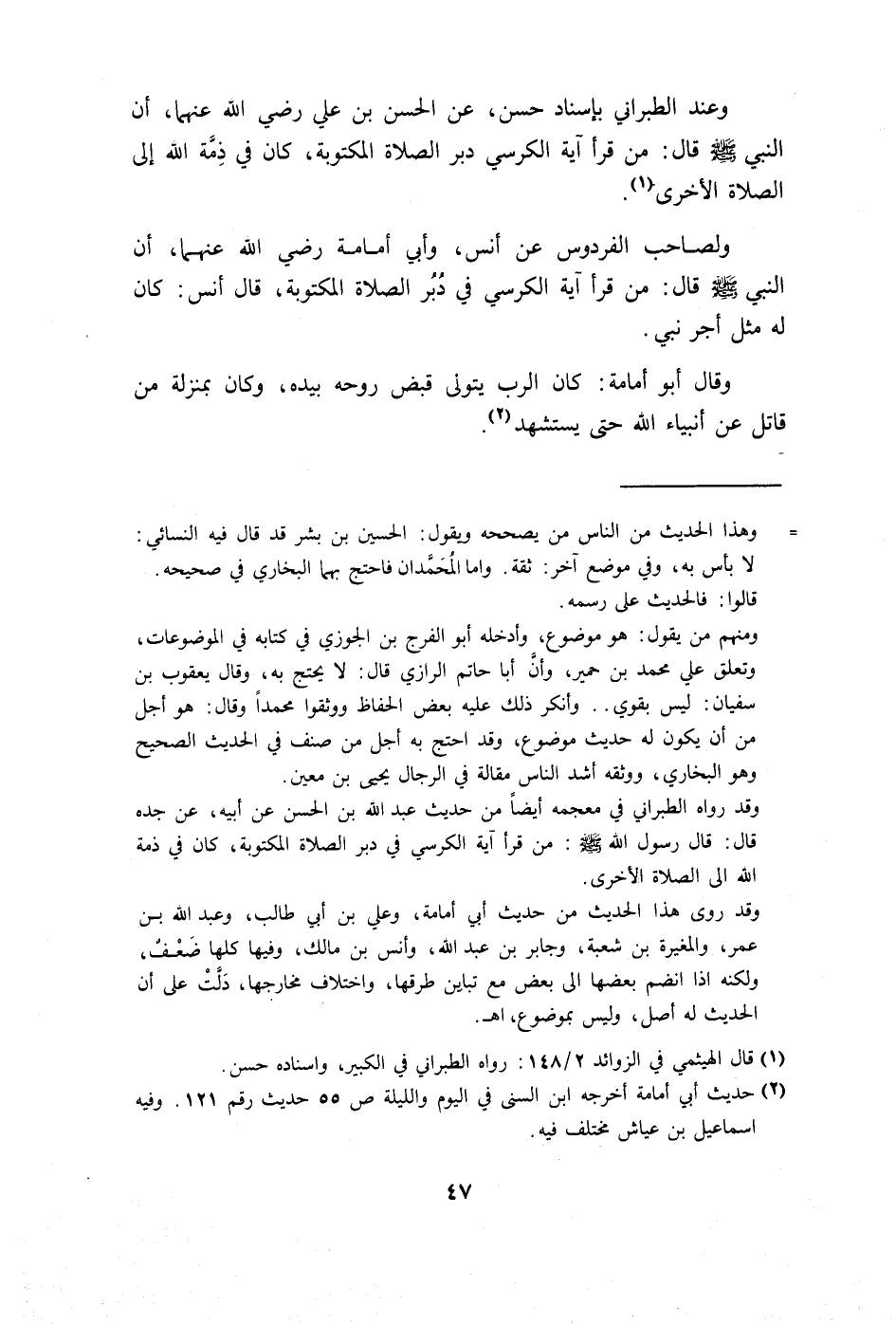 النبي - صلى الله عليه وسلم - قال: من قرأ آية الكرسي في دبر الصلاة المكتوبة، قال أنس: كان له مثل أجر نبي.