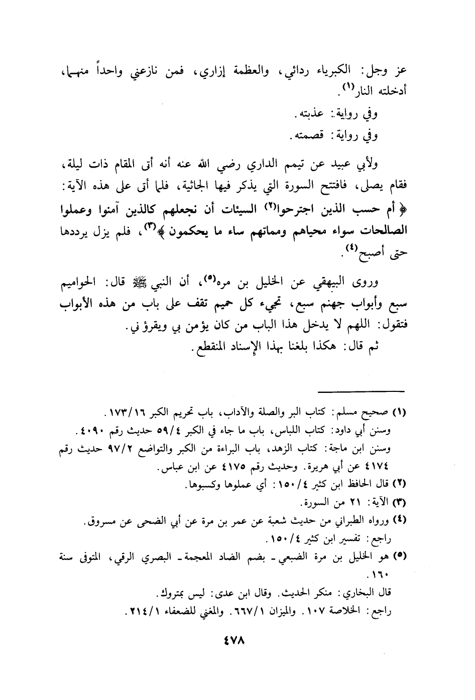 فقام يصلى، فافتتح السورة التي يذكر فيها الجاثية، فلما أتى على هذه الآية: (أَمْ حَسِبَ الَّذِينَ اجْتَرَحُوا السَّيِّئَاتِ أَنْ نَجْعَلَهُمْ كَالَّذِينَ آمَنُوا وَعَمِلُوا الصَّالِحَاتِ سَوَاءً مَحْيَاهُمْ وَمَمَاتُهُمْ سَاءَ مَا يَحْكُمُونَ (21) .