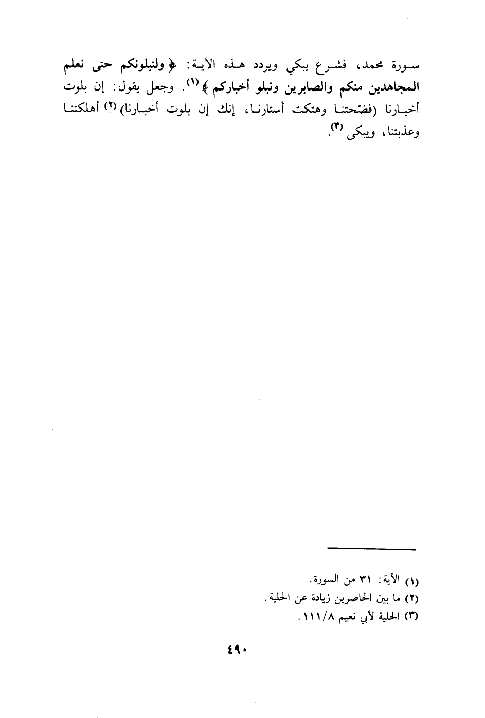 سورة محمد، فشرع يبكي ويردد هذه الآية: (وَلَنَبْلُوَنَّكُمْ حَتَّى نَعْلَمَ الْمُجَاهِدِينَ مِنْكُمْ وَالصَّابِرِينَ وَنَبْلُوَ أَخْبَارَكُمْ (31) .