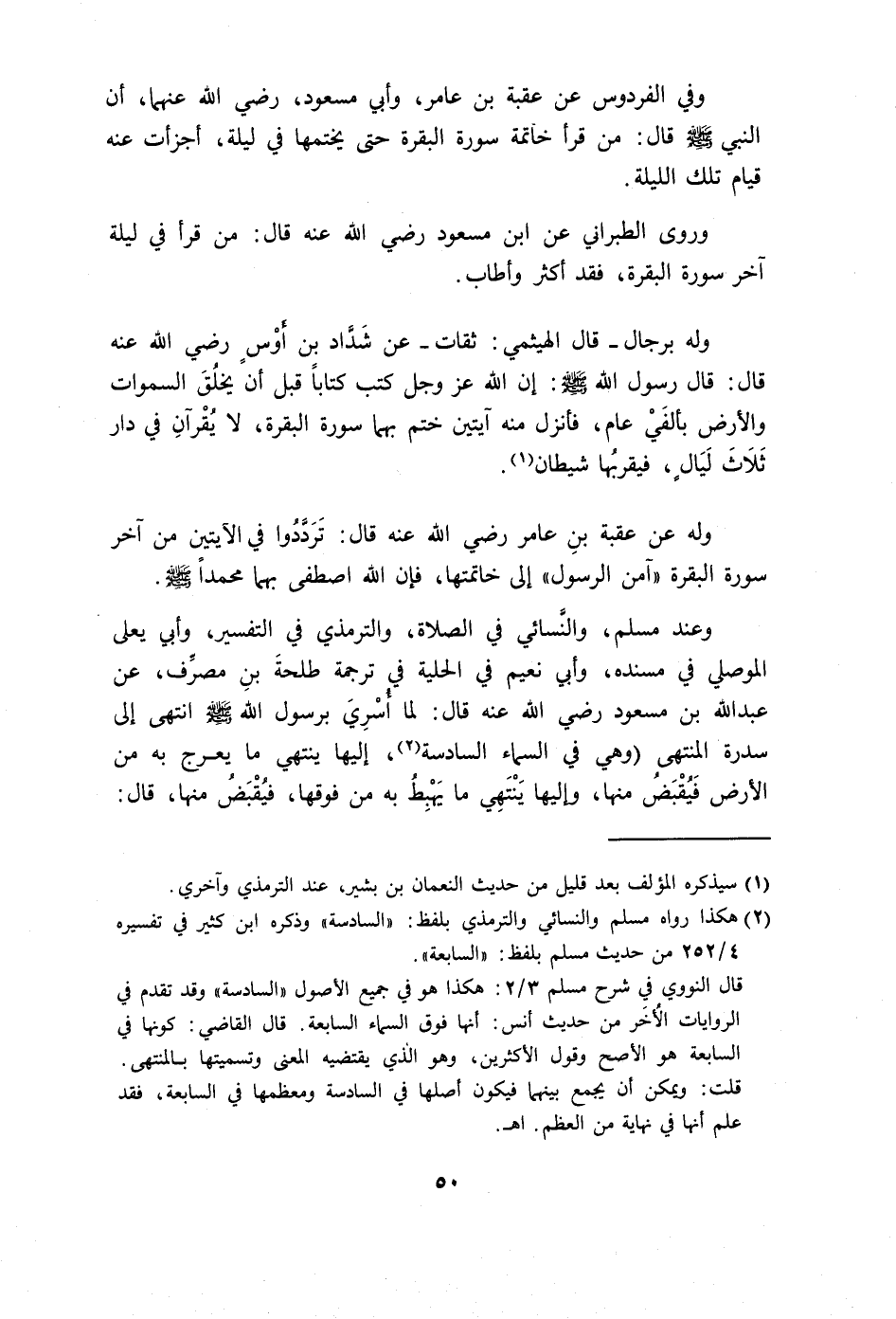 وروى الطبراني عن ابن مسعود رضي الله عنه قال: من قرأ في ليلة