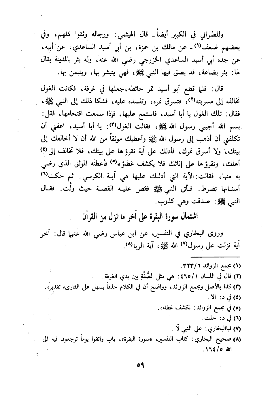 تكلفني أن أذهب إلى رسول الله - صلى الله عليه وسلم - وأعطيك موثقا من الله أن لا أخالفك إلى بيتك، ولا أسرق تمرك، فأدلك على آية تقرؤها على بيتك، فلا تخالف إلى أهلك، وتقرؤها على إنائك فلا يكشف غطاؤه فأعطته الموثق الذي رضي به منها، فقالت: الآية التي أدلك عليها هي آية الكرسي. ثم حكت أسنانها تضرط. فأتى النبي - صلى الله عليه وسلم - فقص عليه القصة حيث ولَّت.