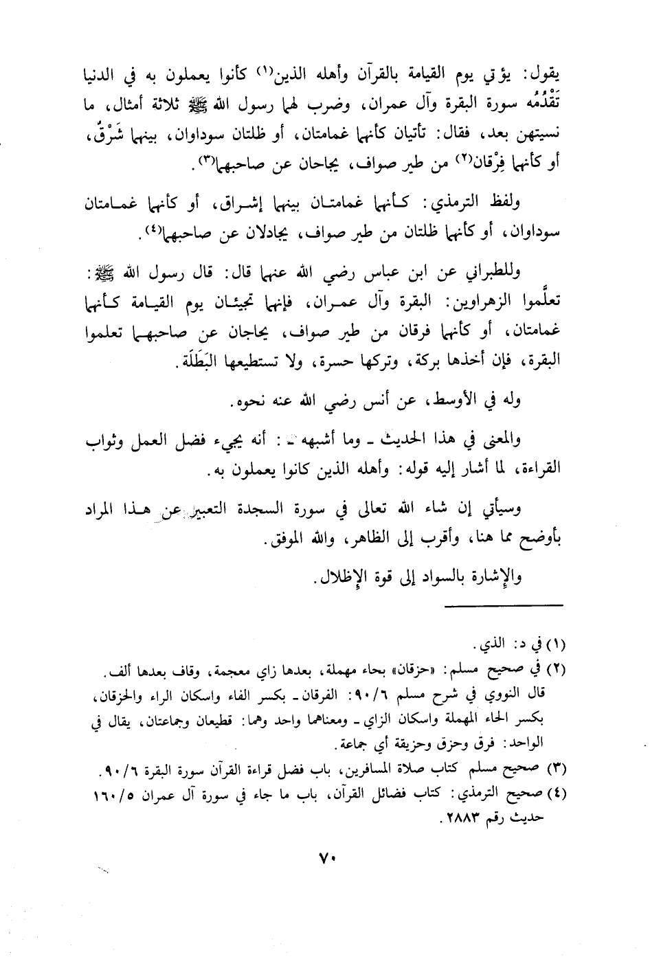 تَقْدُمه سورة البقرة وآل عمران، وضرب لهما رسول الله - صلى الله عليه وسلم - ثلاثة أمثال، ما نسيتهن بعد، فقال: تأتيان كأنهما غمامتان، أو ظلتان سوداوان، بينهما شَرْقٌ، أو كأنهما فِرْقان من طير صواف، يحاجان عن صاحبهما.
