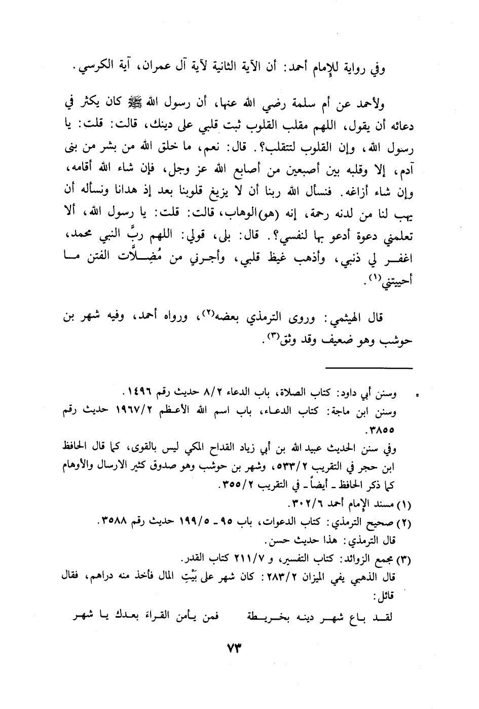 ولأحمد عن أم سلمة رضي الله عنها، أن رسول الله - صلى الله عليه وسلم - كان يكثر في دعائه أن يقول، اللهم مقلب القلوب ثبت قلبي على دينك، قالت: قلت: يا رسول الله، وإن القلوب لتتقلب؟.