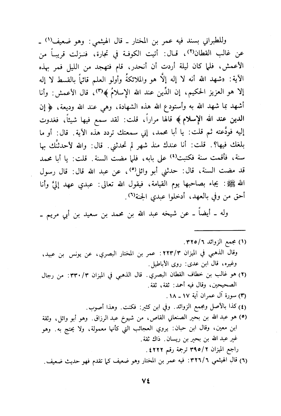 قال الأعمش: وأنا أشهد بما شهد الله به وأستودع الله هذه الشهادة، وهي عند الله وديعة، (إِنَّ الدِّينَ عِنْدَ اللَّهِ الْإِسْلَامُ) قالها مراراً، قلت: لقد سمع فيها شيئاً، فغدوت إليه فودَّعته ثم قلت: يا أبا محمد، إني سمعتك تردد هذه الآية. قال: أو ما بلغك فيها؟.