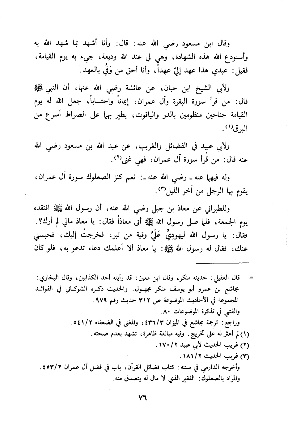 ولأبي الشيخ ابن حبان، عن عائشة رضي الله عنها، أن النبي - صلى الله عليه وسلم - قال: من قرأ سورة البقرة وآل عمران، إيماناً واحتساباً، جعل الله له يوم القيامة جناحين منظومين بالدر والياقوت، يطير بهما على الصراط أسرع من البرق.