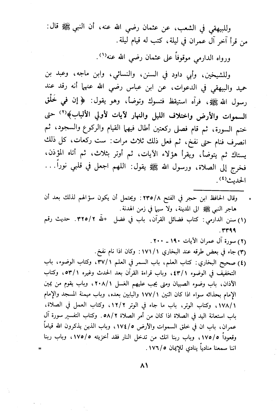 وللبيهقي في الشعب، عن عثمان رضي الله عنه، أن النبي - صلى الله عليه وسلم - قال: من قرأ آخر آل عمران في ليلة، كتب له قيام ليلة.