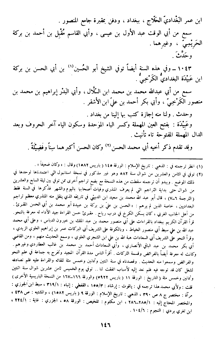1043 - وفي هذه السنة أيضا توفي الشيخ أبو الحسين بن أبي الحسن بن بركة بن عبيدة البغدادي الكرخي.