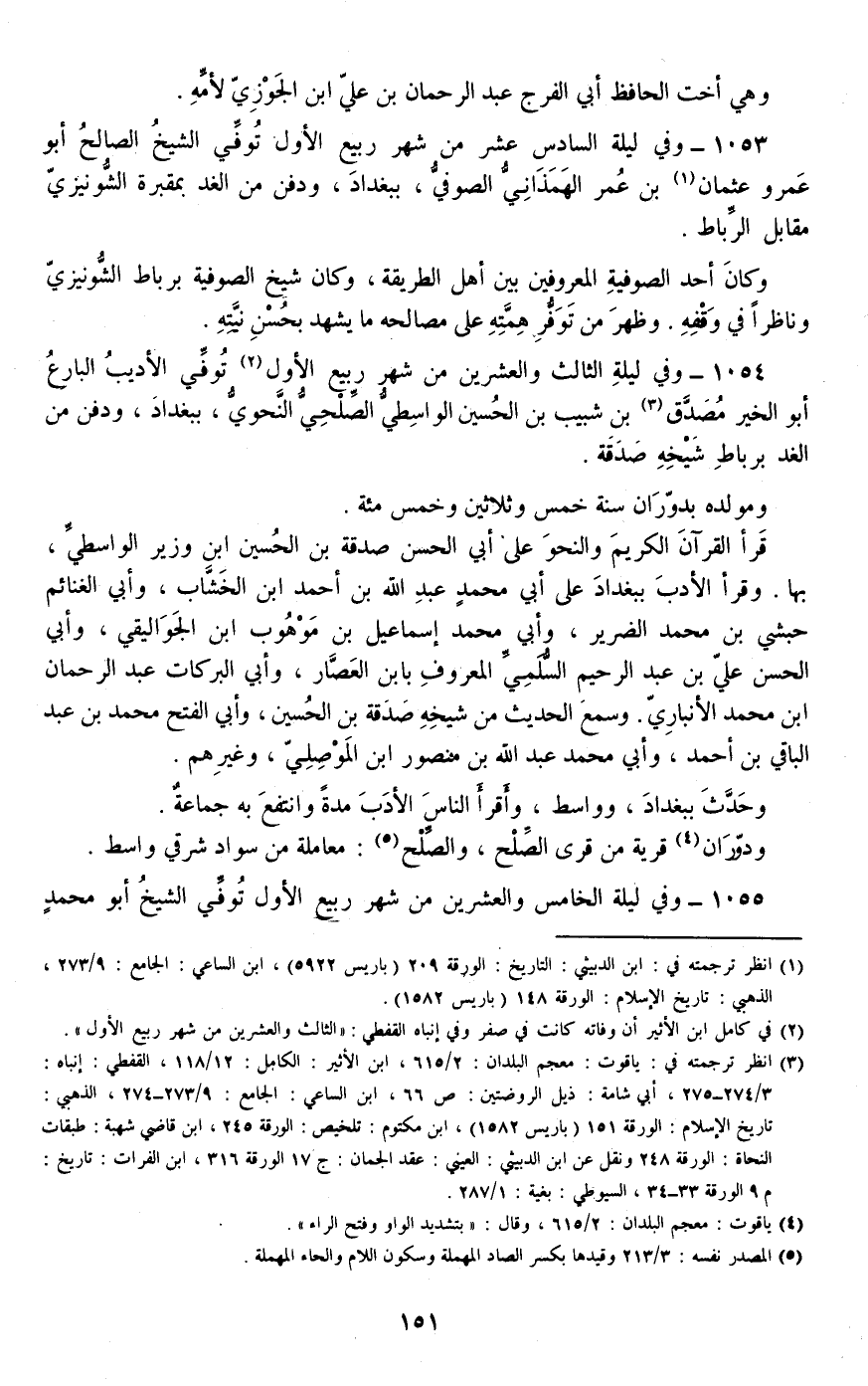 1053 - وفي ليلة السادس عشر من شهر ربيع الأول توفي الشيخ الصالح أبو عمرو عثمان بن عمر الهمذاني الصوفي، ببغداد، ودفن من الغد بمقبرة الشونيزي مقابل الرباط.