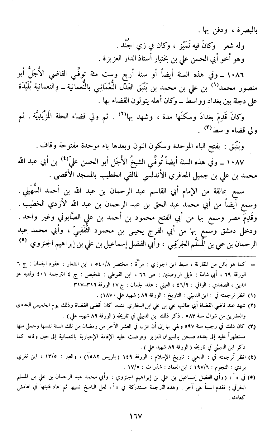 1086 - وفي هذه السنة أيضا أو سنة أربع وست مئة توفي القاضي الأجل أبو منصور محمد بن علي بن محمد بن بنبق العدل النعماني بالنعمانية -والنعمانية بليدة على دجلة بين بغداد وواسط- وكان أهله يتولون القضاء بها.