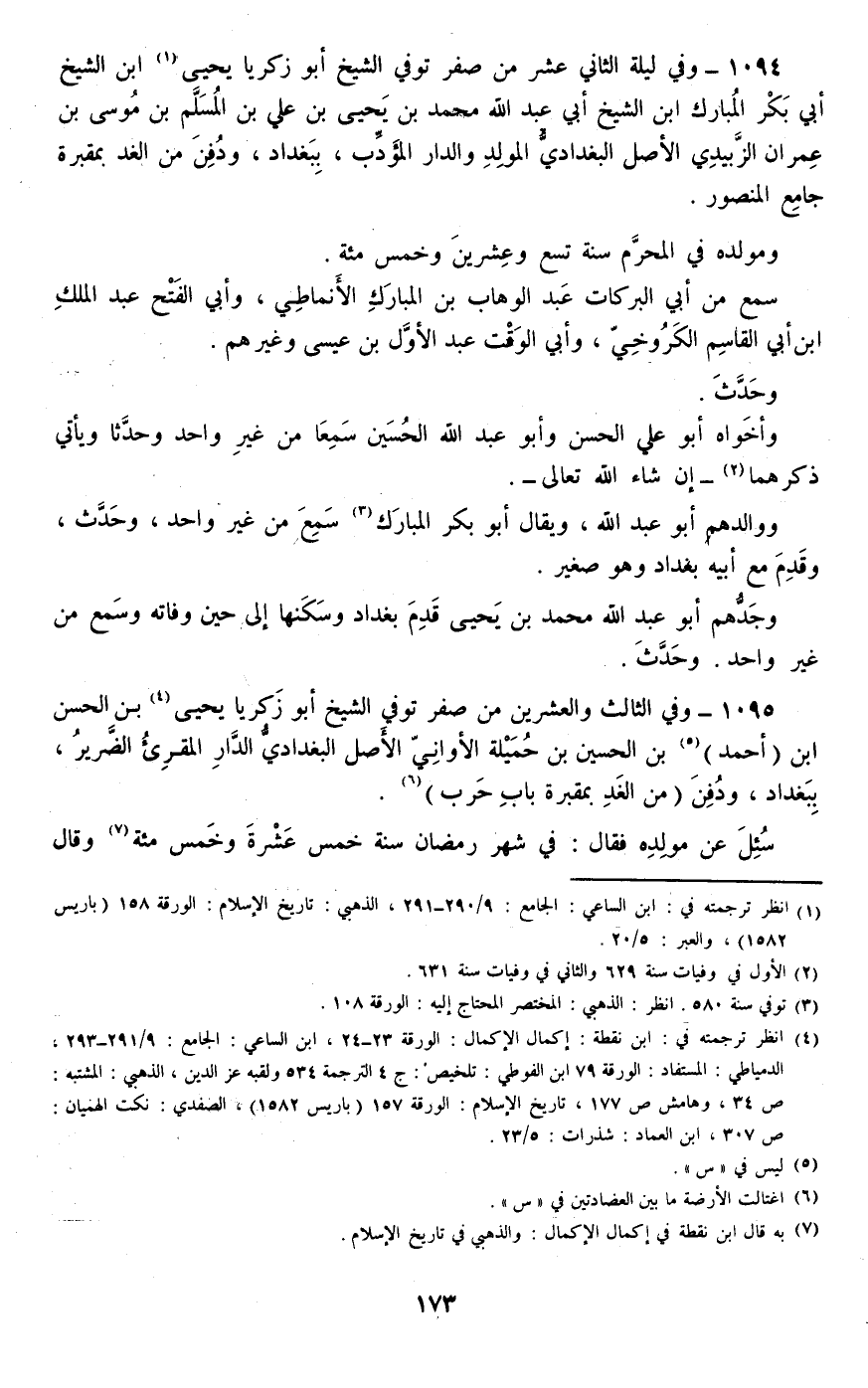 1094 - وفي ليلة الثاني عشر من صفر توفي الشيخ أبو زكريا يحيى ابن الشيخ أبي بكر المبارك ابن الشيخ أبي عبد الله محمد بن يحيى بن علي بن المسلم بن موسى بن عمران الزبيدي الأصل البغدادي المولد والدار المؤدب، ببغداد، ودفن من الغد بمقبرة جامع المنصور.
