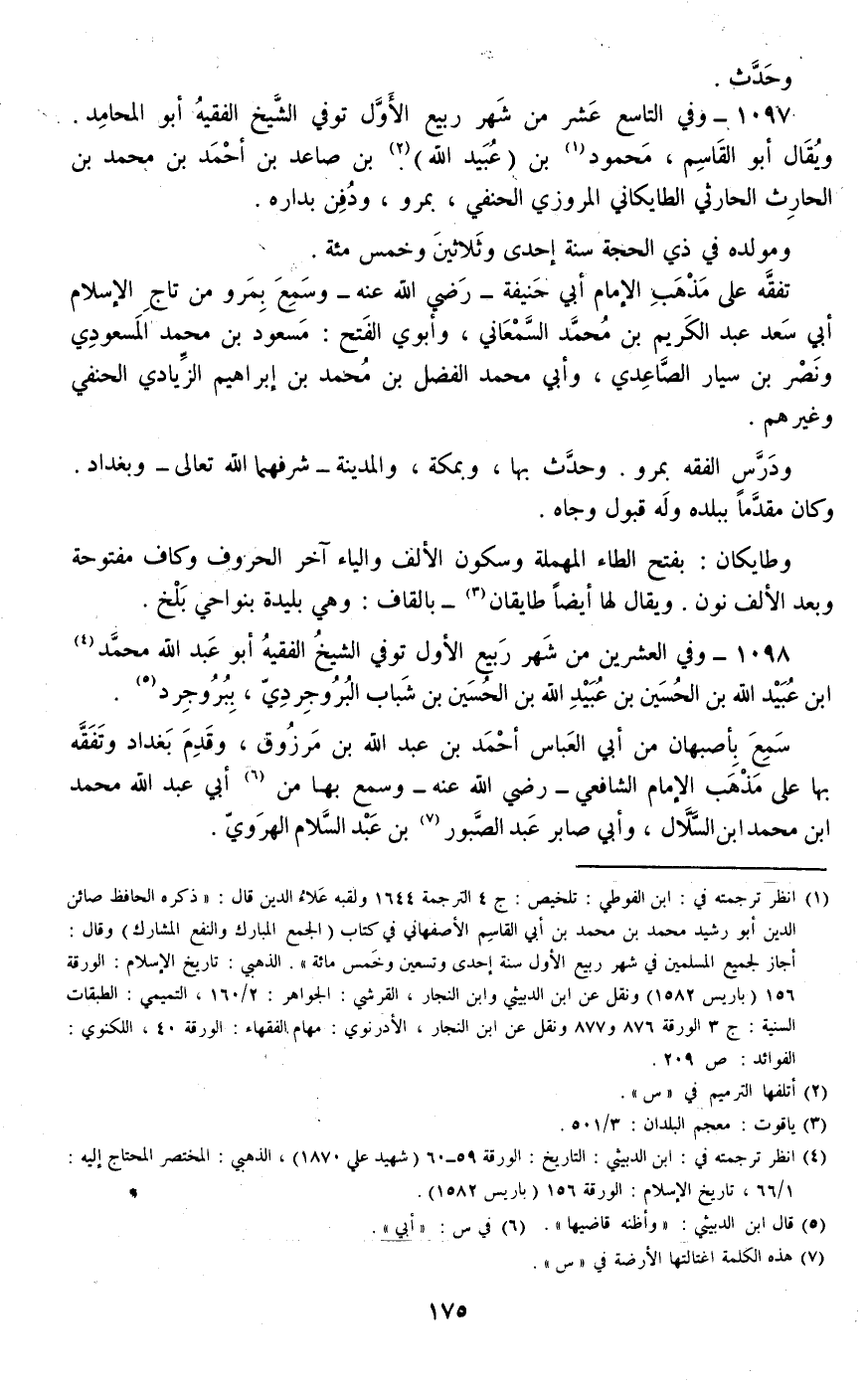 1097 - وفي التاسع عشر من شهر ربيع الأول توفي الشيخ الفقيه أبو المحامد. ويقال أبو القاسم، محمود بن (عبيد الله) بن صاعد بن أحمد بن محمد بن الحارث الحارثي الطايكاني المروزي الحنفي، بمرو، ودفن بداره.