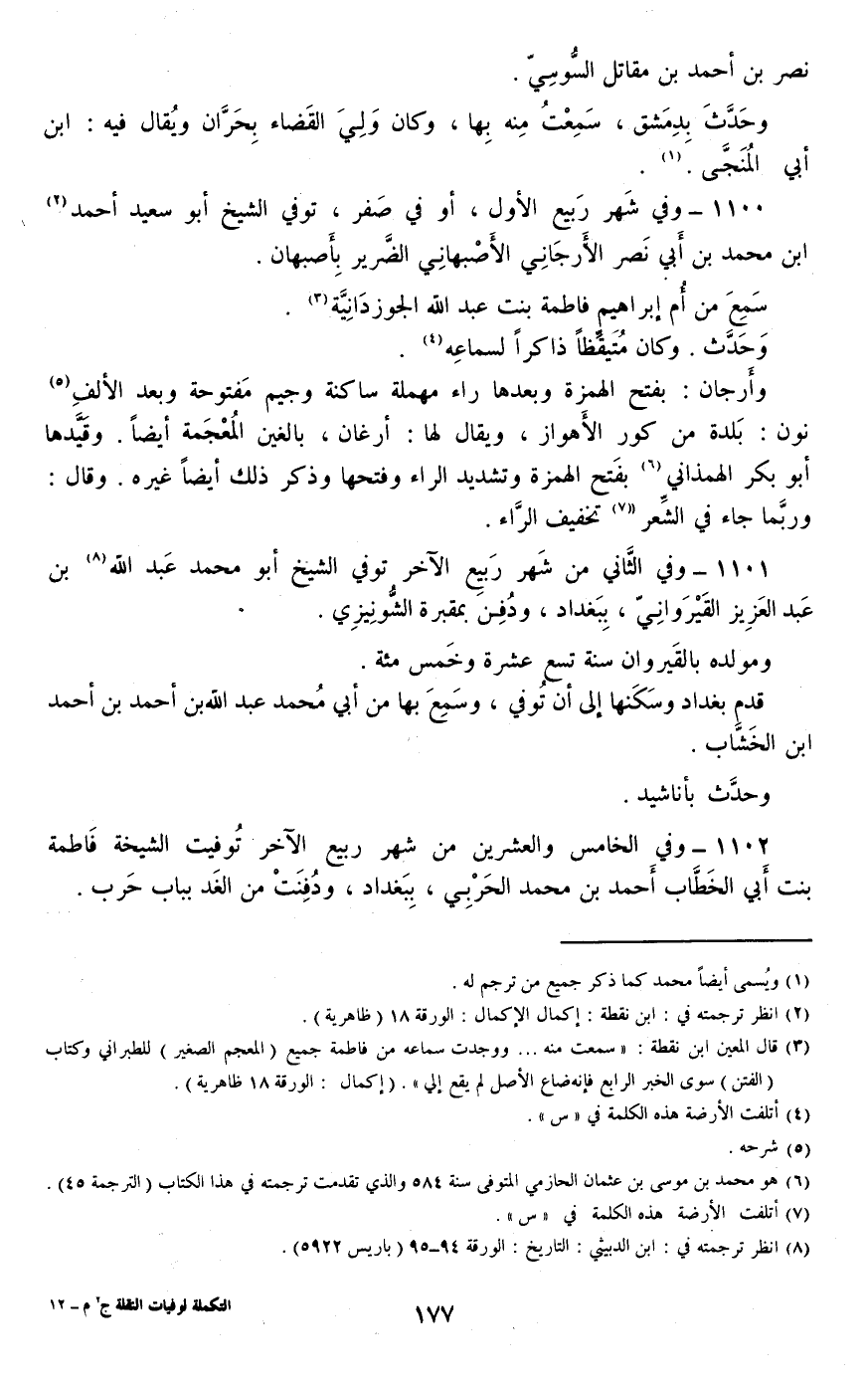 1100 - وفي شهر ربيع الأول، أو في صفر، توفي الشيخ أبو سعيد أحمد بن محمد بن أبي نصر الأرجاني الأصبهاني الضرير بأصبهان.