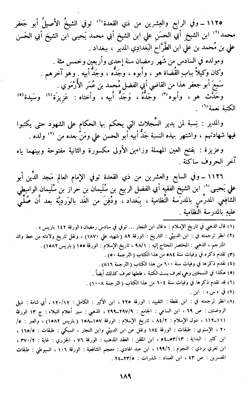 1125 - وفي الرابع والعشرين من ذي القعدة توفي الشيخ الأصيل أبو جعفر محمد ابن الشيخ أبي الحسن علي ابن الشيخ أبي محمد يحيى ابن الشيخ أبي الحسن علي بن محمد بن علي ابن الطراح البغدادي المدير، ببغداد.