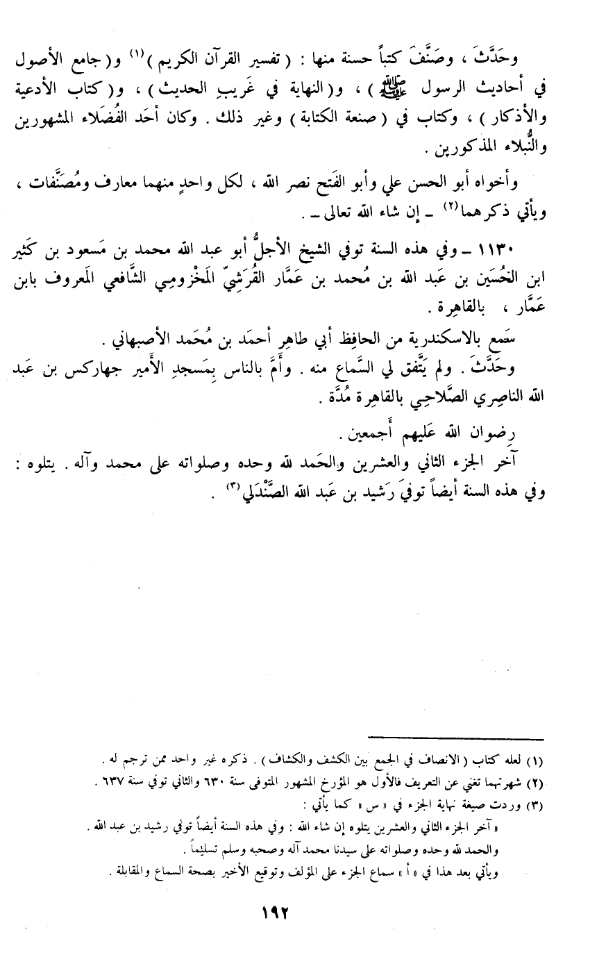 1130 - وفي هذه السنة توفي الشيخ الأجل أبو عبد الله محمد بن مسعود بن كثير بن الحسين بن عبد الله بن محمد بن عمار القرشي المخزومي الشافعي المعروف بابن عمار، بالقاهرة.