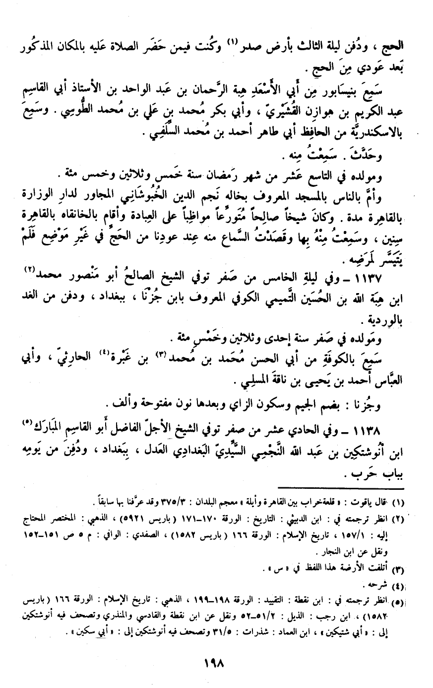 1138 - وفي الحادي عشر من صفر توفي الشيخ الأجل الفاضل أبو القاسم المبارك بن أنوشتكين بن عبد الله النجمي السيدي البغدادي العدل، ببغداد، ودفن من يومه بباب حرب.