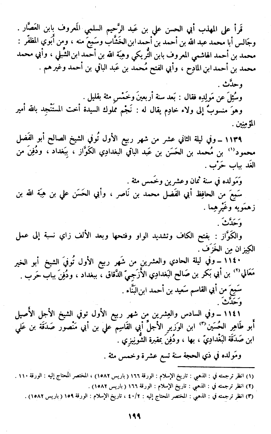1139 - وفي ليلة الثاني عشر من شهر ربيع الأول توفي الشيخ الصالح أبو الفضل محمود بن محمد بن الحسن بن عبد الباقي البغدادي الكواز، ببغداد، ودفن من الغد بباب حرب.