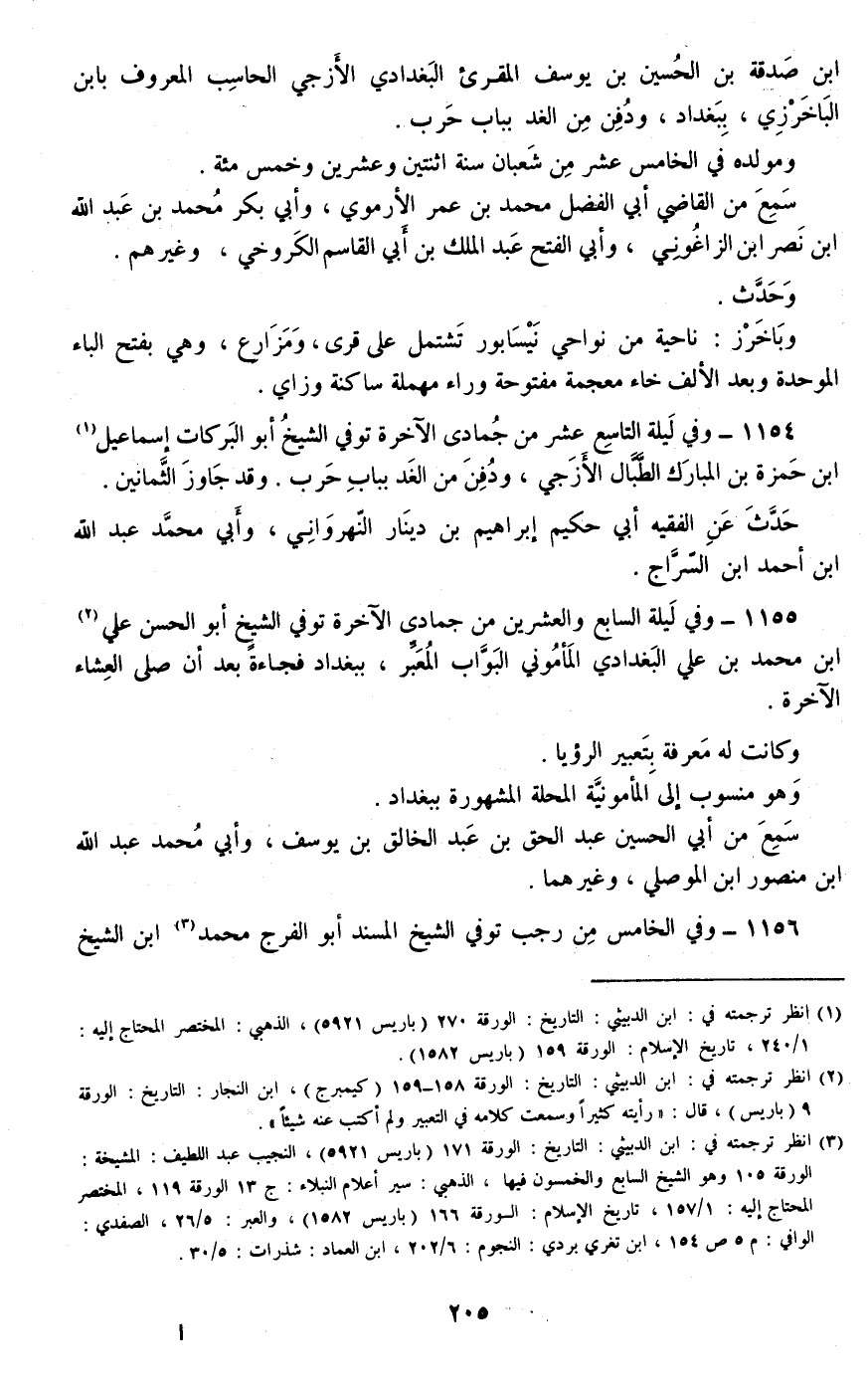 1154 - وفي ليلة التاسع عشر من جمادى الآخرة توفي الشيخ أبو البركات إسماعيل بن حمزة بن المبارك الطبال الأزجي، ودفن من الغد بباب حرب. وقد جاوز الثمانين.