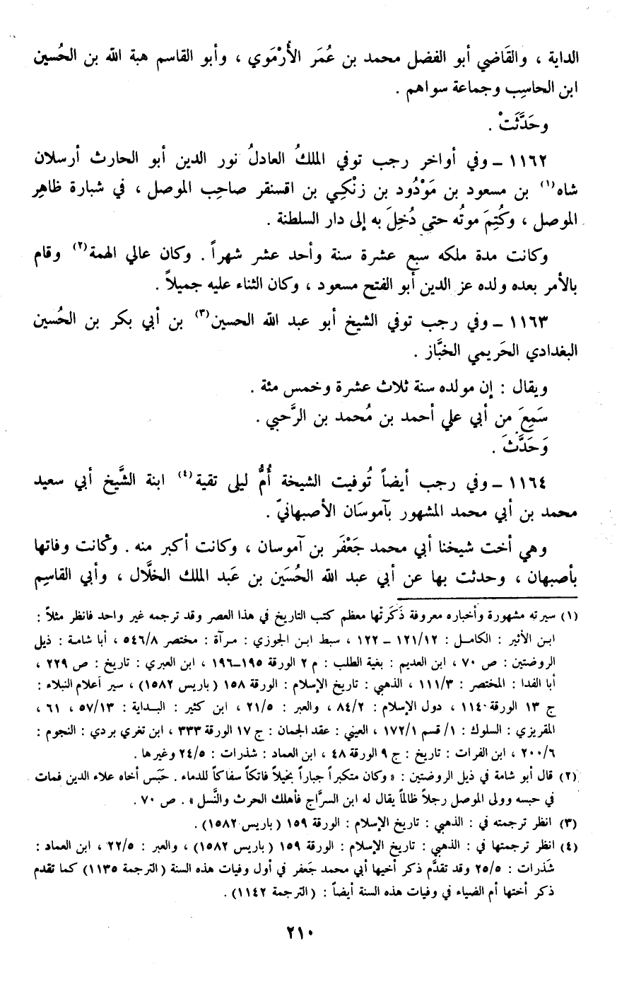 1162 - وفي أواخر رجب توفي الملك العادل نور الدين أبو الحارث أرسلان شاه بن مسعود بن مودود بن زنكي بن اقسنقر صاحب الموصل، في شبارة ظاهر الموصل، وكتم موته حتى دخل به إلى دار السلطنة.