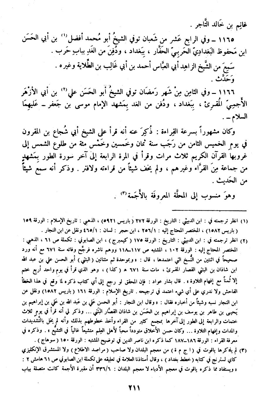 1165 - وفي الرابع عشر من شعبان توفي الشيخ أبو محمد أفضل بن أبي الحسن بن محفوظ البغدادي الحربي الحفار، ببغداد، ودفن من الغد بباب حرب.