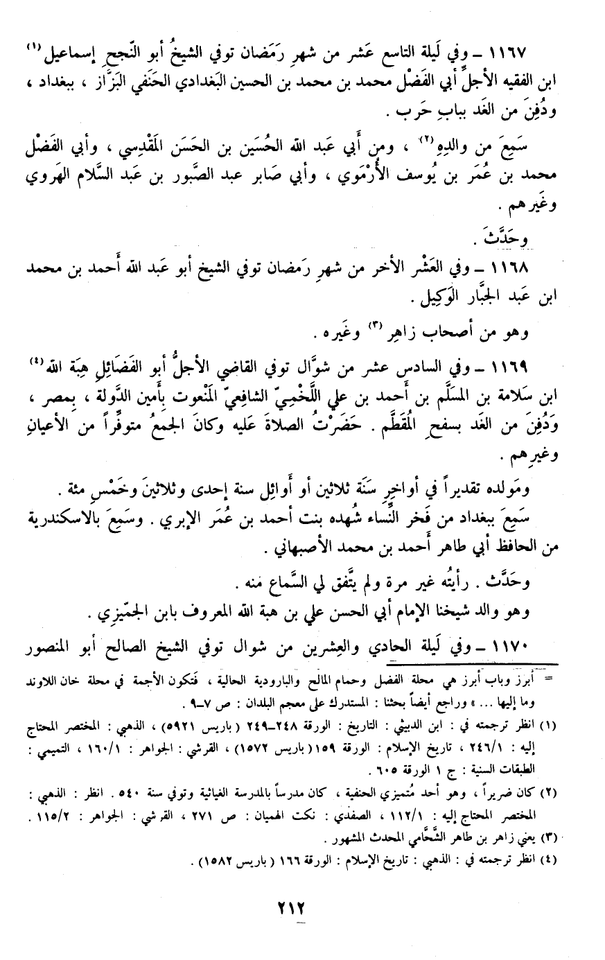 1167 - وفي ليلة التاسع عشر من شهر رمضان توفي الشيخ أبو النجح إسماعيل ابن الفقيه الأجل أبي الفضل محمد بن محمد بن الحسين البغدادي الحنفي البزاز، ببغداد، ودفن من الغد بباب حرب.