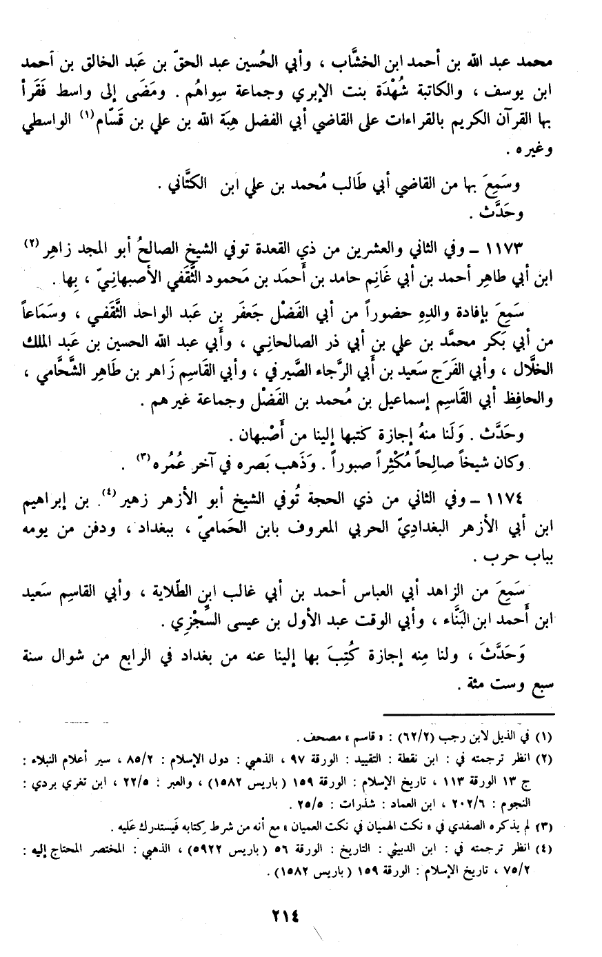 1174 - وفي الثاني من ذي الحجة توفي الشيخ أبو الأزهر زهير بن إبراهيم بن أبي الأزهر البغدادي الحربي المعروف بابن الحمامي، ببغداد، ودفن من يومه بباب حرب.