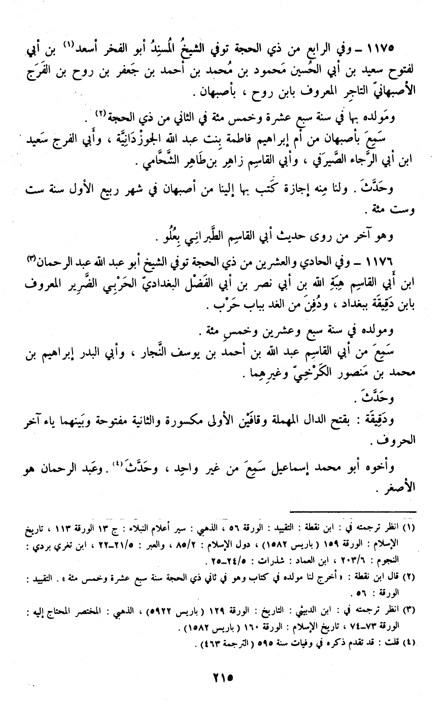 1176 - وفي الحادي والعشرين من ذي الحجة توفي الشيخ أبو عبد الله عبد الرحمان بن أبي القاسم هبة الله بن أبي نصر بن أبي الفضل البغدادي الحربي الضرير المعروف بابن دقيقة ببغداد، ودفن من الغد بباب حرب.