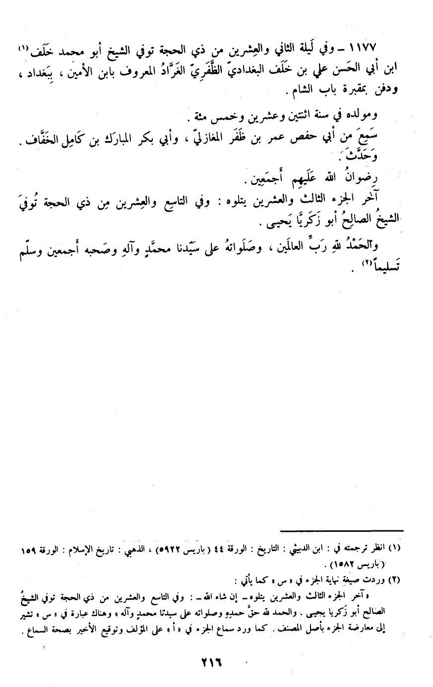 1177 - وفي ليلة الثاني والعشرين من ذي الحجة توفي الشيخ أبو محمد خلف بن أبي الحسن علي بن خلف البغدادي الظفري الغراد المعروف بابن الأمين، ببغداد، ودفن بمقبرة باب الشام.