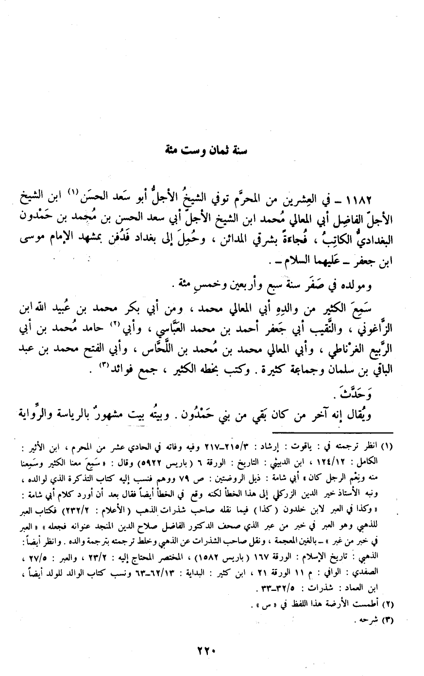 1182 - في العشرين من المحرم توفي الشيخ الأجل أبو سعد الحسن ابن الشيخ الأجل الفاضل أبي المعالي محمد ابن الشيخ الأجل أبي سعد الحسن بن محمد بن حمدون البغدادي الكاتب، فجاءة بشرقي المدائن، وحمل إلى بغداد فدفن بمشهد الإمام موسى بن جعفر -عليهما السلام-.