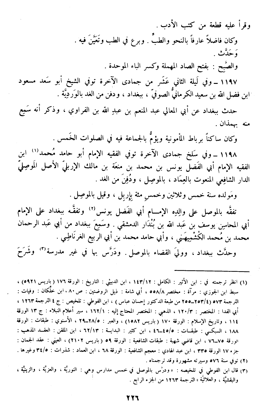 1198 - وفي سلخ جمادى الآخرة توفي الفقيه الإمام أبو حامد محمد ابن الفقيه الإمام أبي الفضل يونس بن محمد بن منعة بن مالك الإربلي الأصل الموصلي الدار الشافعي المنعوت بالعماد، بالموصل، ودفن من الغد.