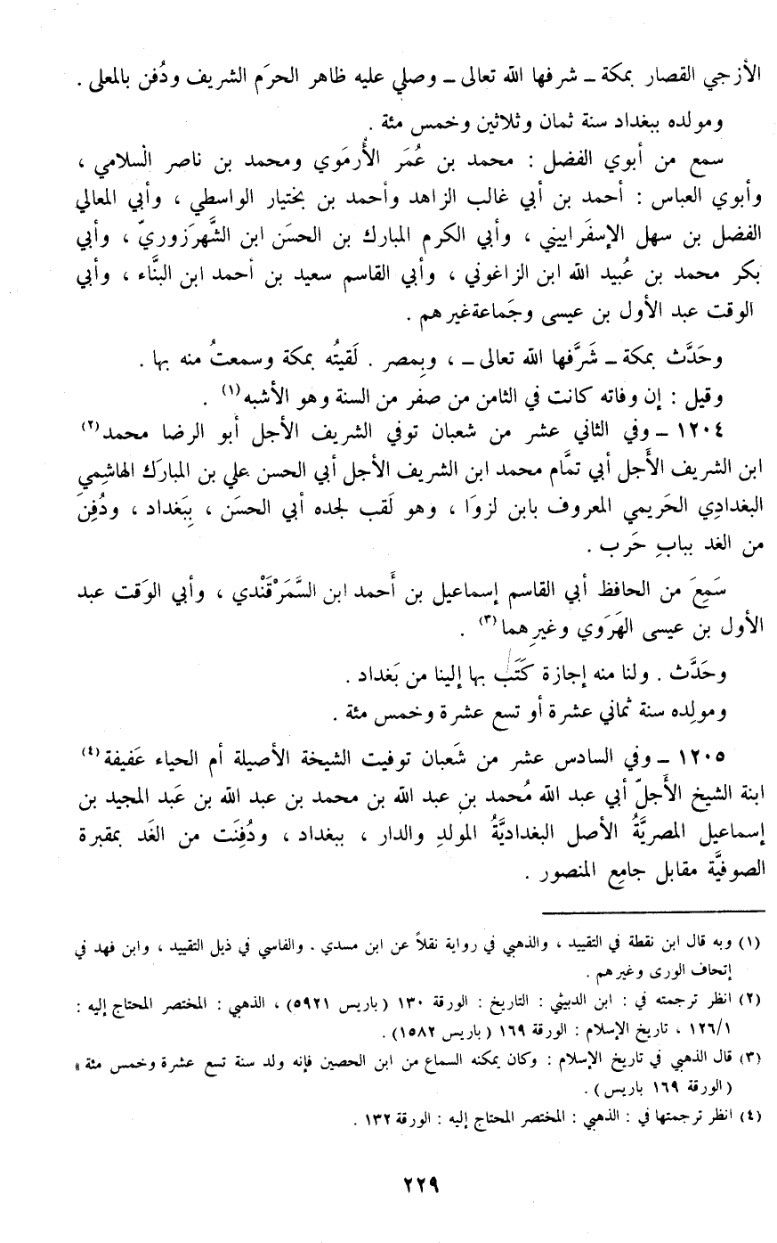 1204 - وفي الثاني عشر من شعبان توفي الشريف الأجل أبو الرضا محمد ابن الشريف الأجل أبي تمام محمد ابن الشريف الأجل أبي الحسن علي بن المبارك الهاشمي البغدادي الحريمي المعروف بابن لزوا، وهو لقب لجده أبي الحسن، ببغداد، ودفن من الغد بباب حرب.