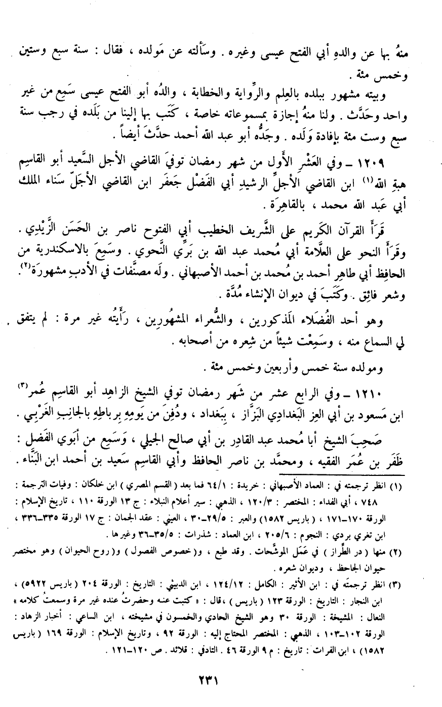 1209 - وفي العشر الأول من شهر رمضان توفي القاضي الأجل السعيد أبو القاسم هبة الله ابن القاضي الأجل الرشيد أبي الفضل جعفر ابن القاضي الأجل سناء الملك أبي عبد الله محمد، بالقاهرة.