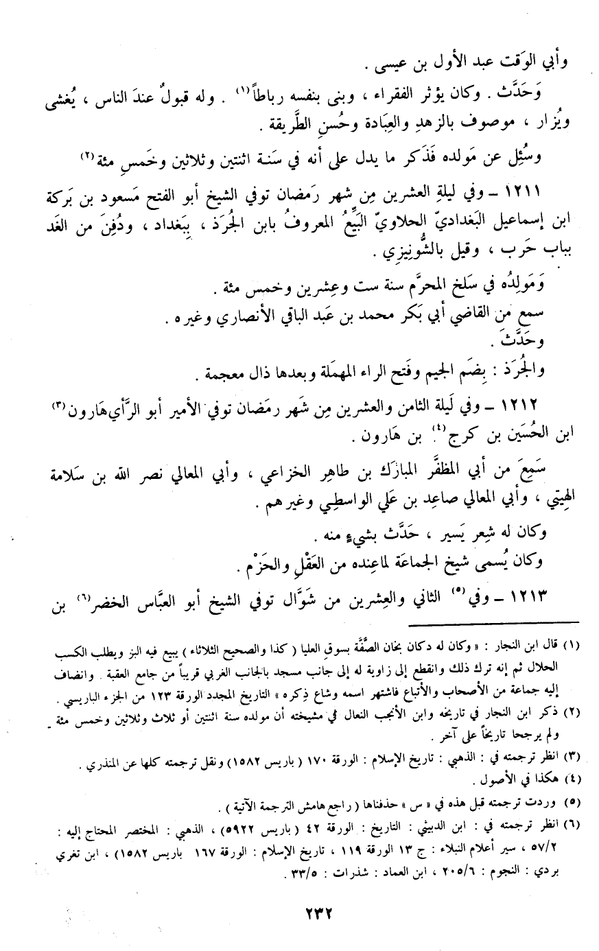 1211 - وفي ليلة العشرين من شهر رمضان توفي الشيخ أبو الفتح مسعود بن بركة بن إسماعيل البغدادي الحلاوي البيع المعروف بابن الجرذ، ببغداد، ودفن من الغد بباب حرب، وقيل بالشونيزي.