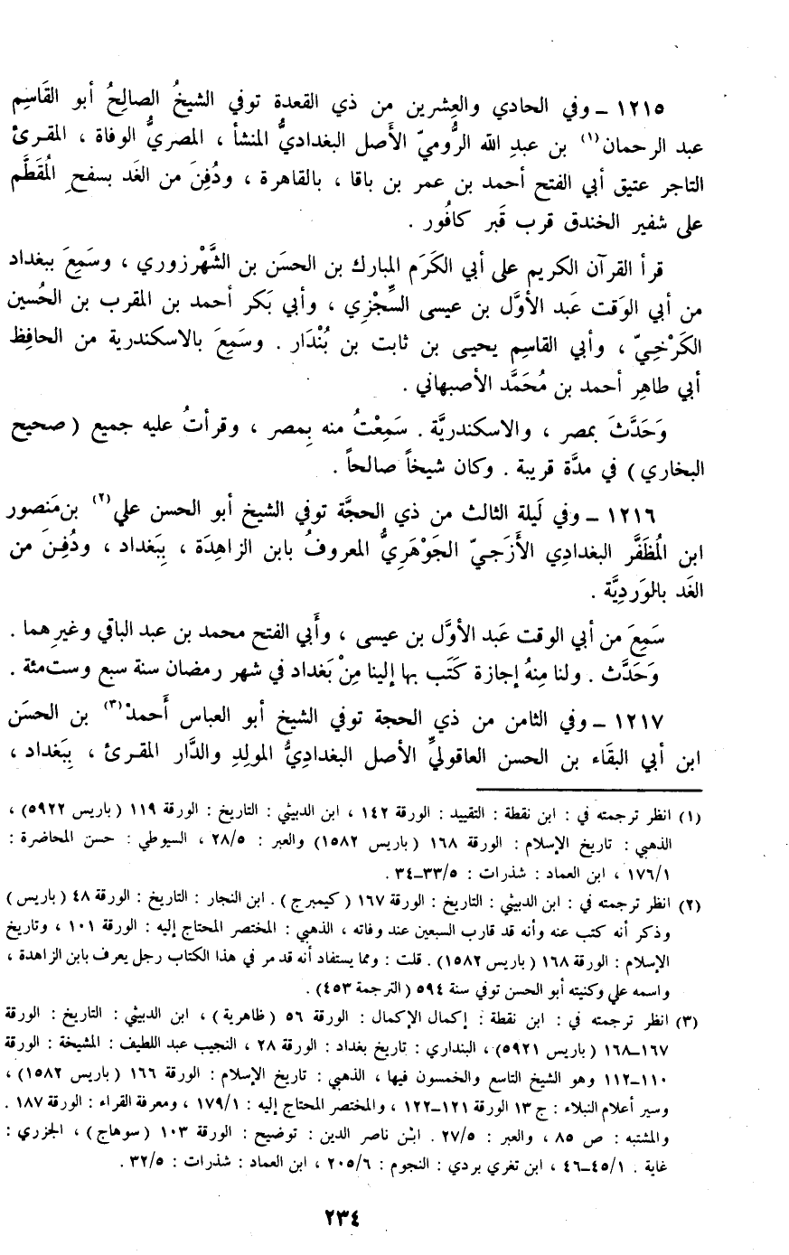1215 - وفي الحادي والعشرين من ذي القعدة توفي الشيخ الصالح أبو القاسم عبد الرحمان بن عبد الله الرومي الأصل البغدادي المنشأ، المصري الوفاة، المقرئ التاجر عتيق أبي الفتح أحمد بن عمر بن باقا، بالقاهرة، ودفن من الغد بسفح المقطم على شفير الخندق قرب قبر كافور.