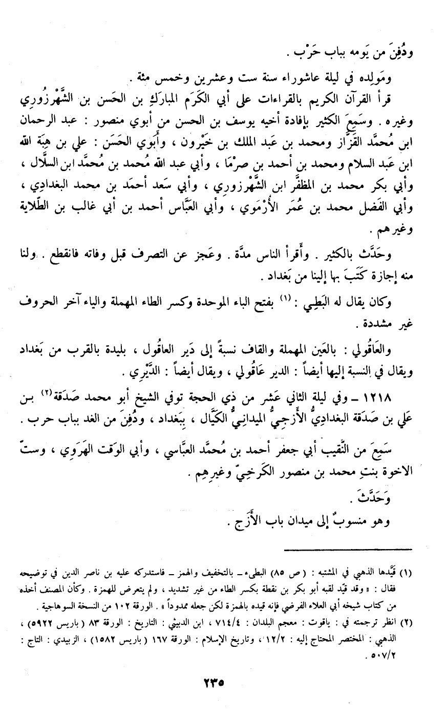 1218 - وفي ليلة الثاني عشر من ذي الحجة توفي الشيخ أبو محمد صدقة بن علي بن صدقة البغدادي الأزجي الميداني الكيال، ببغداد، ودفن من الغد بباب حرب.