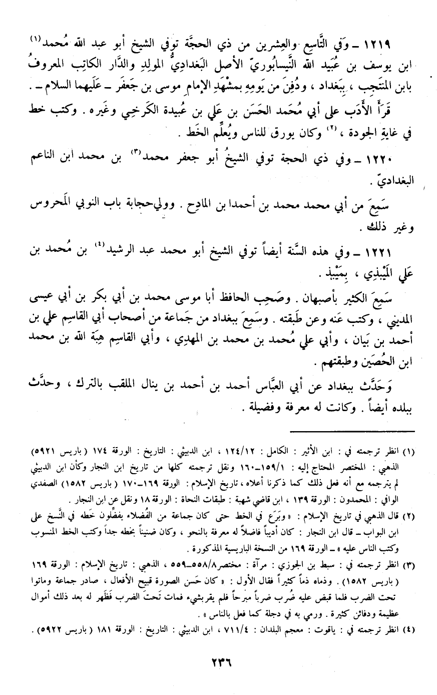 1219 - وفي التاسع والعشرين من ذي الحجة توفي الشيخ أبو عبد الله محمد بن يوسف بن عبيد الله النيسابوري الأصل البغدادي المولد والدار الكاتب المعروف بابن المنتجب، ببغداد، ودفن من يومه بمشهد الإمام موسى بن جعفر -عليهما السلام-.
