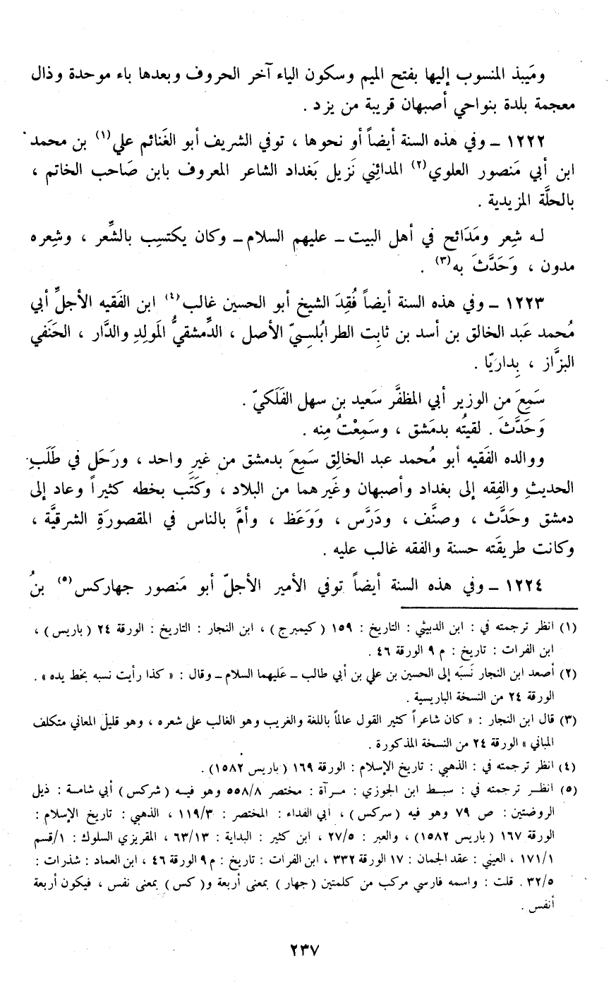 1222 - وفي هذه السنة أيضا أو نحوها، توفي الشريف أبو الغنائم علي بن محمد بن أبي منصور العلوي المدائني نزيل بغداد الشاعر المعروف بابن صاحب الخاتم، بالحلة المزيدية.