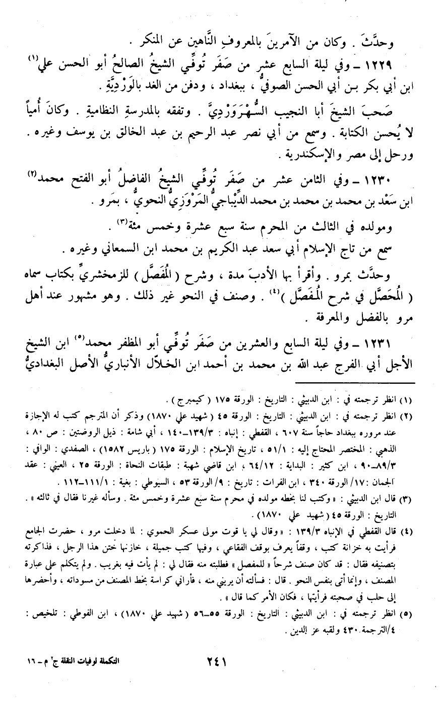 1229 - وفي ليلة السابع عشر من صفر توفي الشيخ الصالح أبو الحسن علي بن أبي بكر بن أبي الحسن الصوفي، ببغداد، ودفن من الغد بالوردية.