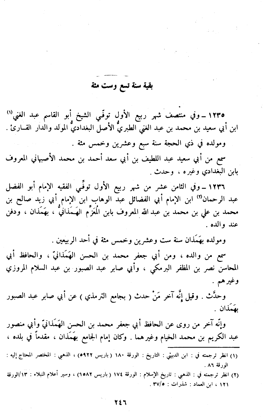 1236 - وفي الثامن عشر من شهر ربيع الأول توفي الفقيه الإمام أبو الفضل عبد الرحمان ابن الإمام أبي الفضائل عبد الوهاب ابن الإمام أبي زيد صالح بن محمد بن علي بن محمد بن عبد الله المعروف بابن المعزم الهمذاني، بهمذان، ودفن عند والده.