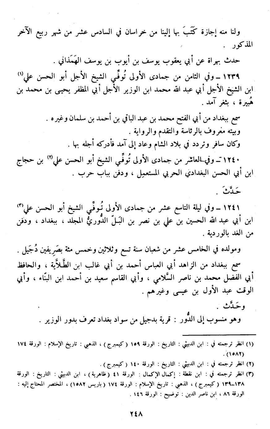 1239 - وفي الثامن من جمادى الأولى توفي الشيخ الأجل أبو الحسن علي ابن الشيخ الأجل أبي عبد الله محمد ابن الوزير الأجل أبي المظفر يحيى بن محمد بن هبيرة، بثغر آمد.