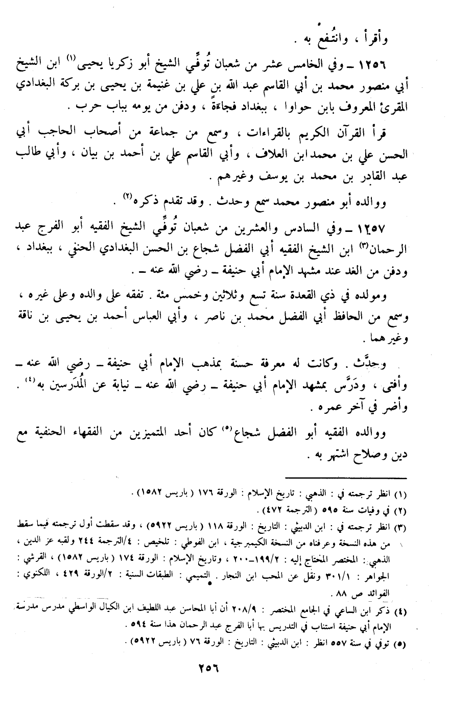 1257 - وفي السادس والعشرين من شعبان توفي الشيخ الفقيه أبو الفرج عبد الرحمان ابن الشيخ الفقيه أبي الفضل شجاع بن الحسن البغدادي الحنفي، ببغداد، ودفن من الغد عند مشهد الإمام أبي حنيفة -رضي الله عنه-.