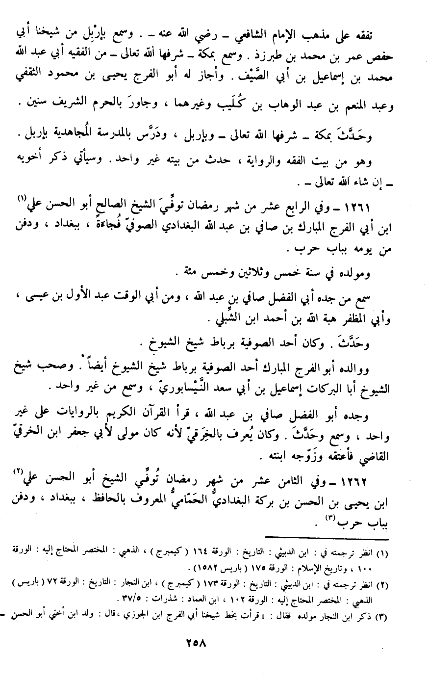 1261 - وفي الرابع عشر من شهر رمضان توفي الشيخ الصالح أبو الحسن علي بن أبي الفرج المبارك بن صافي بن عبد الله البغدادي الصوفي فجاءة، ببغداد، ودفن من يومه بباب حرب.