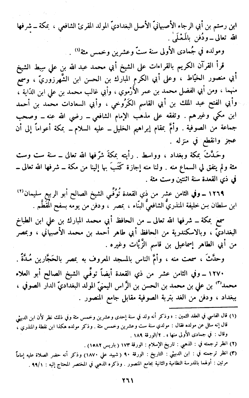 1270 - وفي الثامن عشر من ذي القعدة أيضا توفي الشيخ الصالح أبو العلاء محمد بن علي بن محمد بن الحسن بن الراس اليمني المولد البغدادي الدار الصوفي، ببغداد، ودفن من الغد بتربة الصوفية مقابل جامع المنصور.