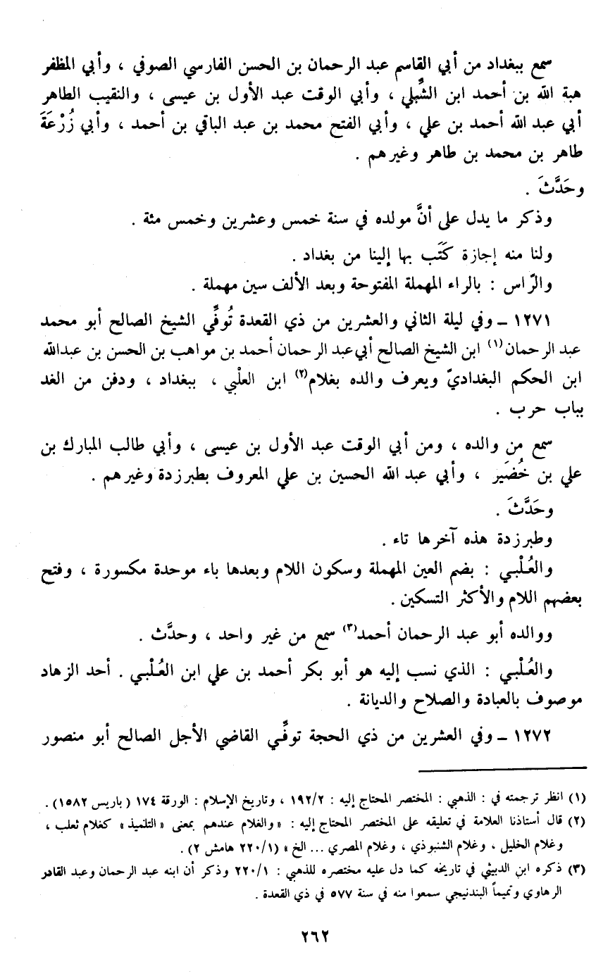 1271 - وفي ليلة الثاني والعشرين من ذي القعدة توفي الشيخ الصالح أبو محمد عبد الرحمان ابن الشيخ الصالح أبي عبد الرحمان أحمد بن مواهب بن الحسن بن عبد الله بن الحكم البغدادي ويعرف والده بغلام ابن العلبي، ببغداد، ودفن من الغد بباب حرب.