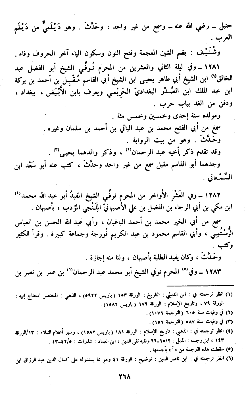 1283 - وفي المحرم توفي الشيخ أبو محمد عبد الرحمان بن عمر بن نصر بن الحسن بن سعد بن عبد الله بن باز الموصلي المنعوت بالعفيف، #269# بالموصل.