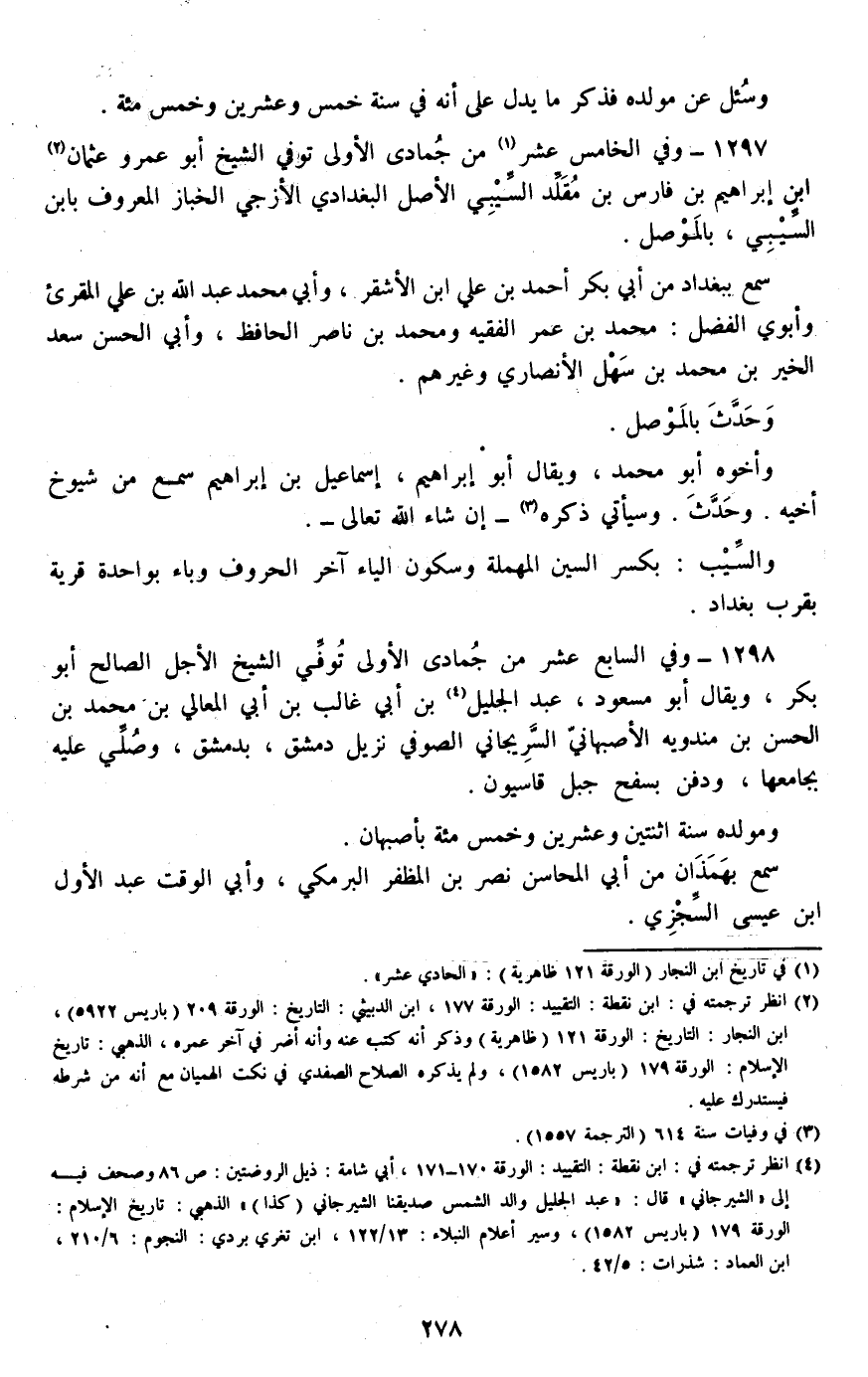 1298 - وفي السابع عشر من جمادى الأولى توفي الشيخ الأجل الصالح أبو بكر، ويقال أبو مسعود، عبد الجليل بن أبي غالب بن أبي المعالي بن محمد بن الحسن بن مندويه الأصبهاني السريجاني الصوفي نزيل دمشق، بدمشق، وصلي عليه بجامعها، ودفن بسفح جبل قاسيون.