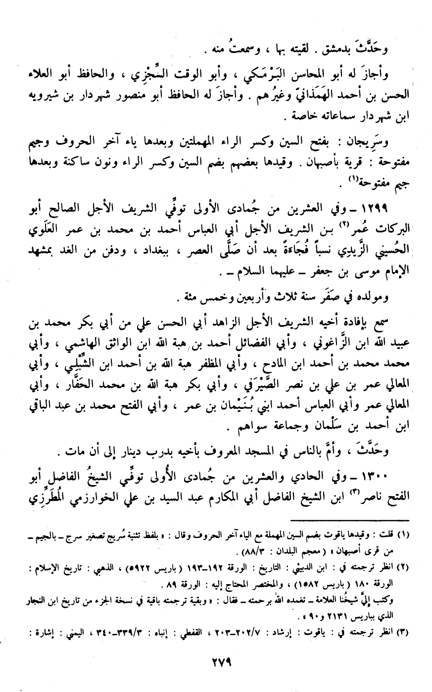 1299 - وفي العشرين من جمادى الأولى توفي الشريف الأجل الصالح أبو البركات عمر بن الشريف الأجل أبي العباس أحمد بن محمد بن عمر العلوي الحسيني الزيدي نسبا فجاءة بعد أن صلى العصر، ببغداد، ودفن من الغد بمشهد الإمام موسى بن جعفر -عليهما السلام-.